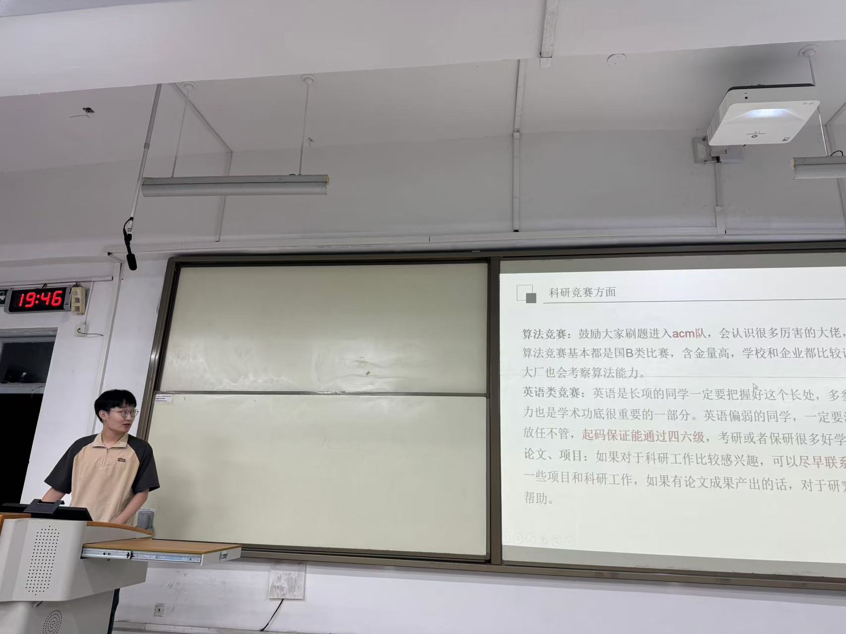 本次见面会还邀请了软件工程2021级的四名同学介绍了各自在大学学习和生活中的经验。孟正(软件工程专业第1,已保送浙江大学)分享了自己在大学前三年的学习经历,介绍了自己如何学习专业课、参与教师科研项目以及各类竞赛的经验;曾担任过公司ACM队队长的许维杰(软件工程专业第3,已保送苏州大学)同学重点介绍了ICPC竞赛的情况,期望新同学都能够参加ICPC竞赛提高自己的能力;孙宁轩(软件工程专业第5,已保送本校)作为女生代表,分享了自己在学习以及参与教师科研项目方面的经验;李闯(签约美团)则分享了自己在大学期间课程学习以及参与各种软件开发项目的经验。